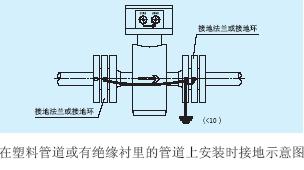b.傳感器在塑料管道上或在有絕緣襯里的管道上安裝,傳感器的兩端應安裝接地環、或接地法蘭、或帶有接地電極的短管,按下圖接地。